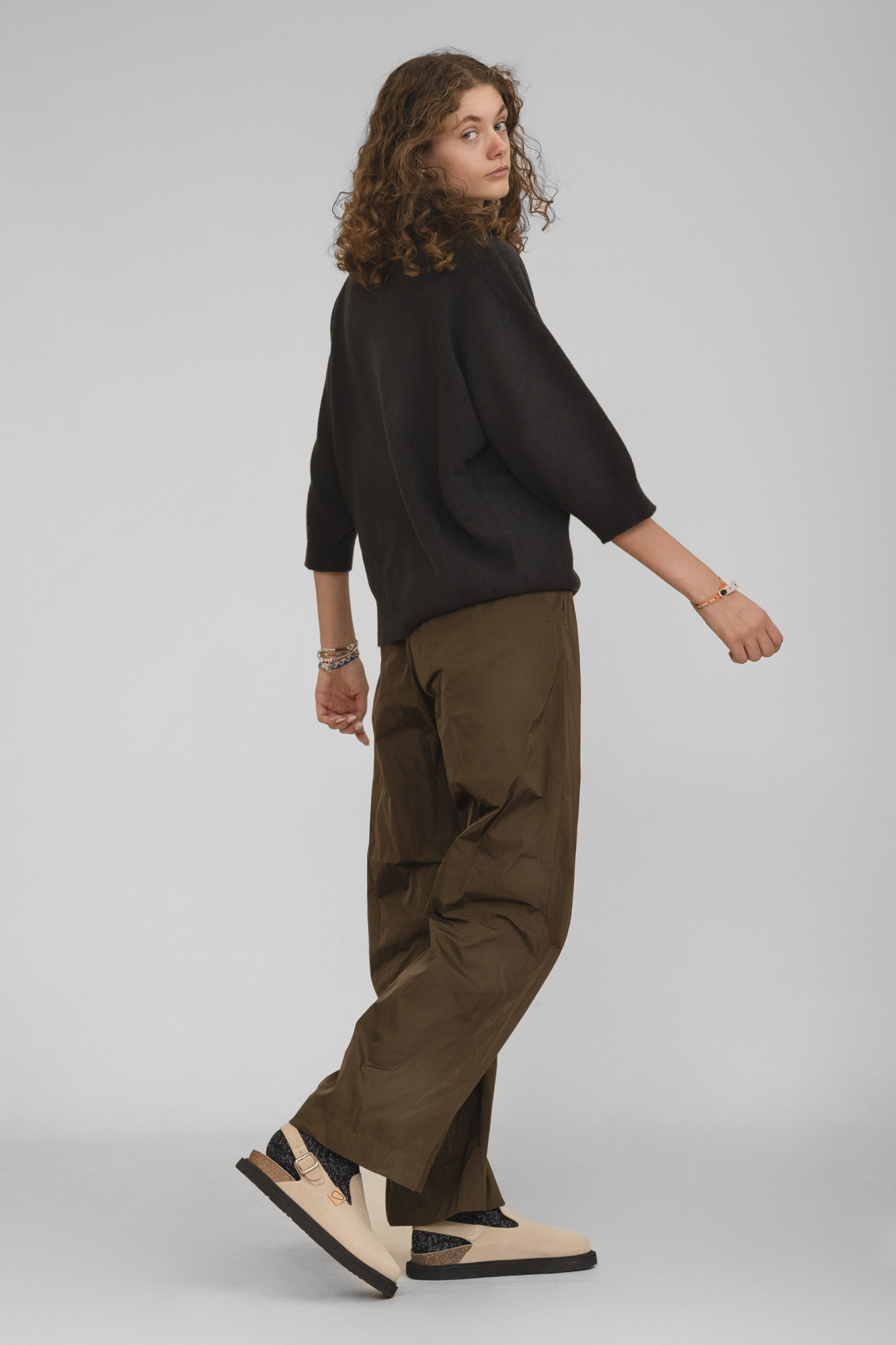 Seamless crew neck knitwear, 3/4 sleeves, 100% wool.