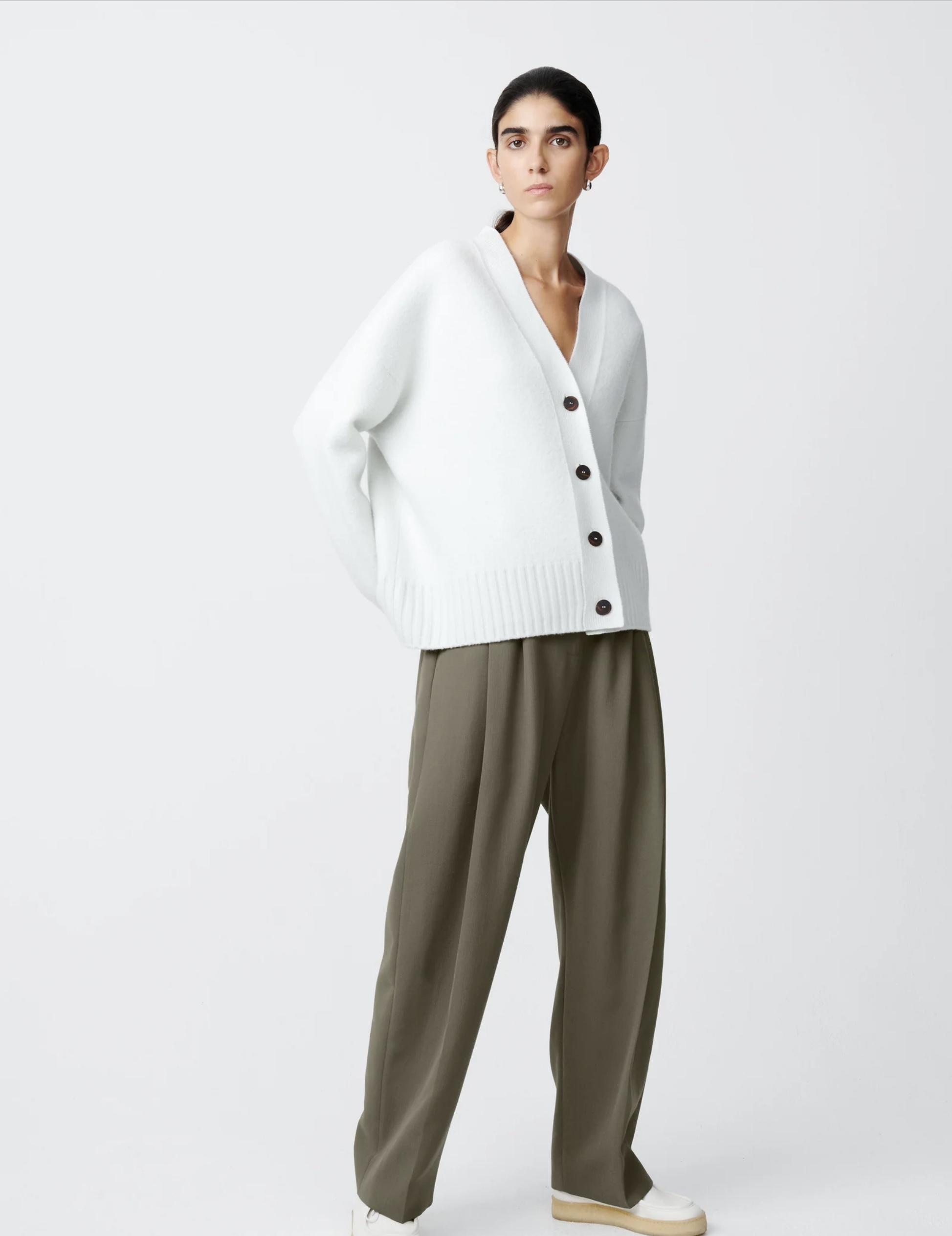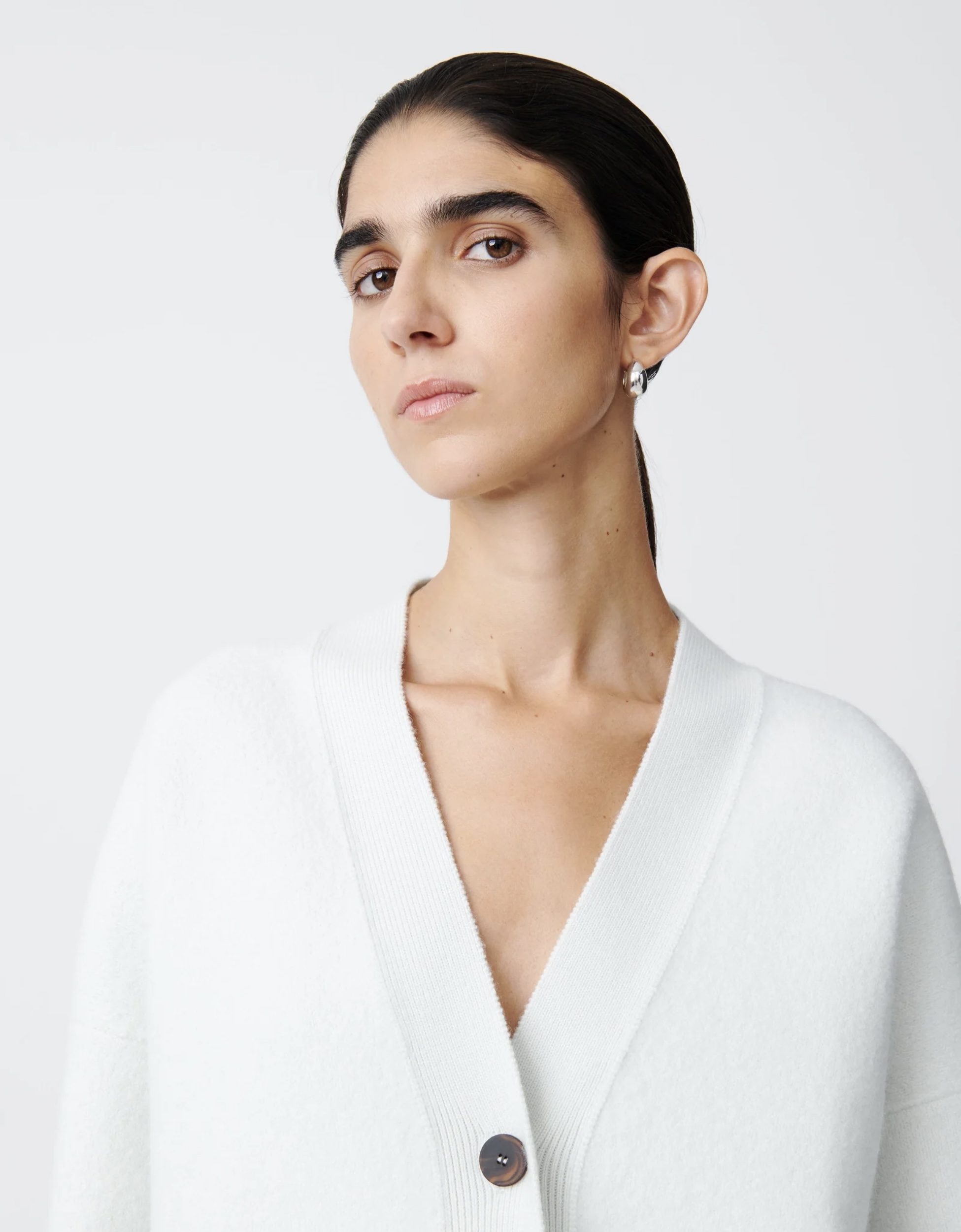 Cardigan 100% laine merinos boiled, boxy shape, accentuated by its gently elongated sleeves.